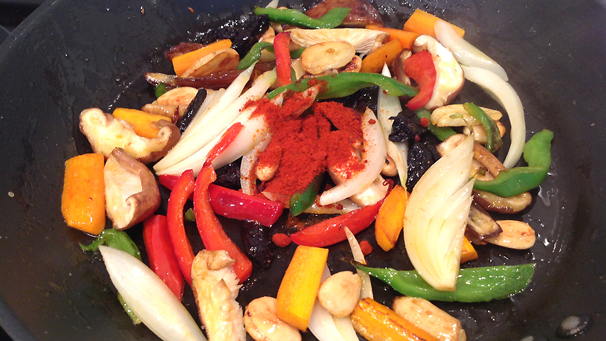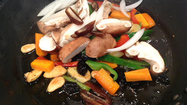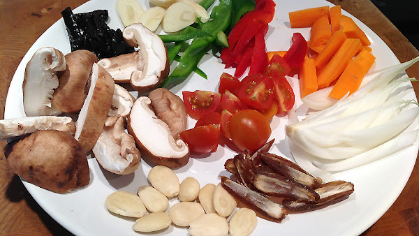 La guarnición: ajo, cebolla, pimiento verde y rojo, setas shiitake, almendras, dátiles, ciruelas pasas y unos tomateros cereza.