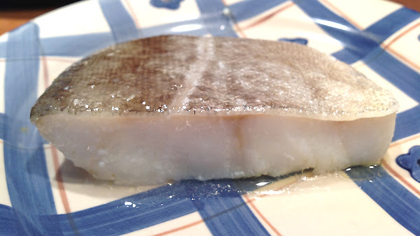Tras el confitado dejo reposar el bacalao en un plato.