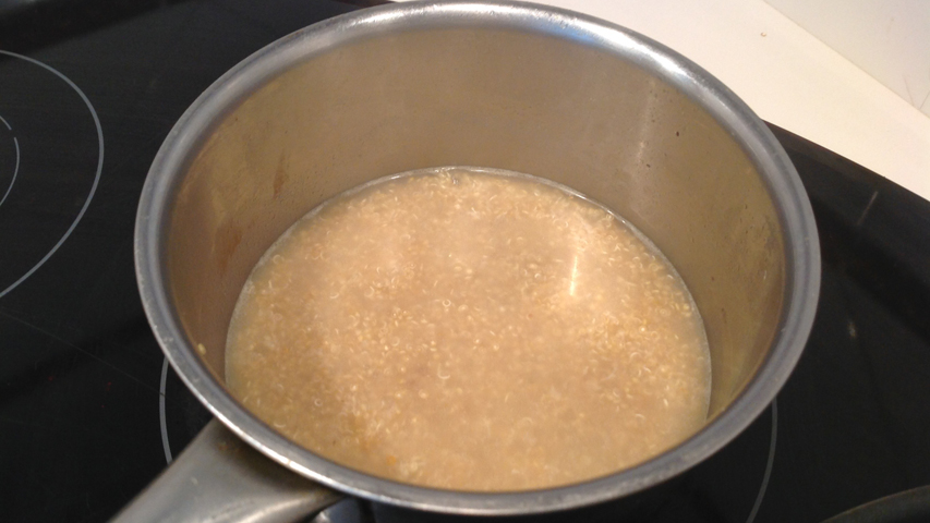 Pon el caldo de pescado en un cazo a fuego medio e introduce en él la quinoa. Deja cocer unos 15 minutos. Apaga el fuego y reserva tapado.