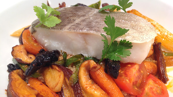 Pon encima de la verdura el lomo de bacalao.