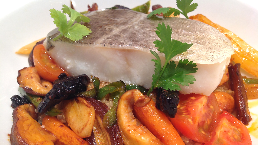 Sofríe las verduras. Pon una sartén a fuego medio-alto (7/10) y vierte en ella en primer lugar unos granos de comino. Después pon un poco del aceite donde has confitado el bacalao. Sofríe en la sartén las almendras, las verduras, las setas, los dátiles y en el último momento incorpora los tomates.
