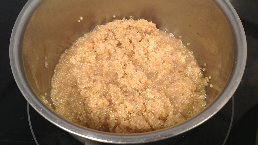 La quinoa se cuece en unos 10 minutos a fuego medio en un líquido que puede ser agua. Yo para este plato he usado un caldo de pescado.
