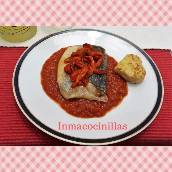 Primeramente hacer la salsa de tomate triturando la cebolla y el ajo , se añade el azúcar y la sal con el tomate en una sartén y freir a fuego medio hasta que este a gusto y apartar , mientras se pone al fuego una olla ó cazo alto y poner como dos dedos de aove , calentar y cuando alcance 80 grados de temperatura poner dentro con la piel hacia arriba los dos trozos de bacalao , apagar el fuego tapar y dejar 30 minutos y estará lito para servir napando la base del plato con la salsa de tomate poner encima el bacalao ( yo he acompañado con unas tiras de pimiento rojo asado y una tapa de tortilla de patata , eso ya cada uno ).....espero os guste.......