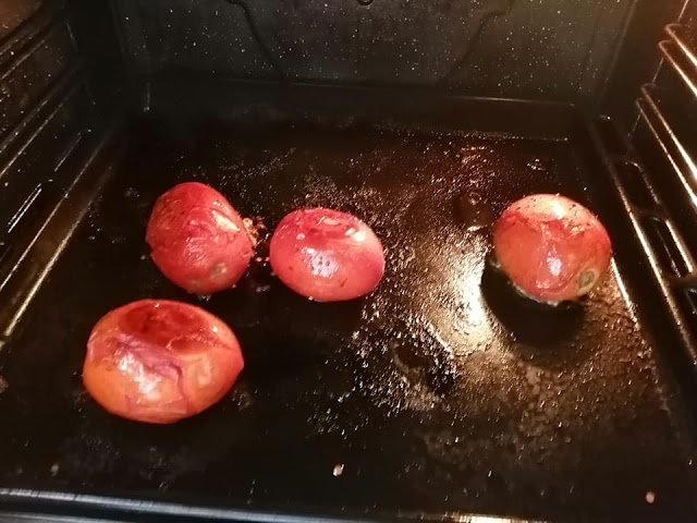 Poner horno a 180 grados los tomates, berenjena, pimientos rojos y cebolla.