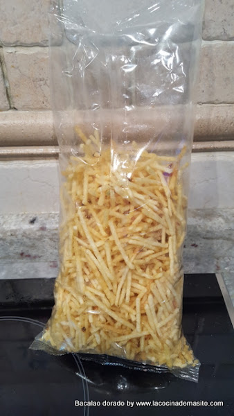 Mientras se sofríe picamos el bacalao en tozos muy pequeños también