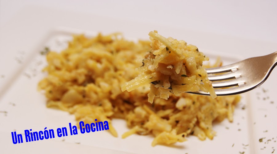 - Poner en una cacerola antiaderente un poco de aceite de oliva y pochar la cebolla a fuego bajo, cuando esté tierna subimos el fuego e incorporamos el bacalao, cocinamos asta que evapore el agua que soltará y se empiece a desmigar.