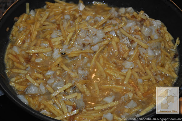 Lo primero que hacemos es batir los huevos y poner las patatas dentro, de tal forma que vayan perdiendo su rigidez y se queden blanditas.