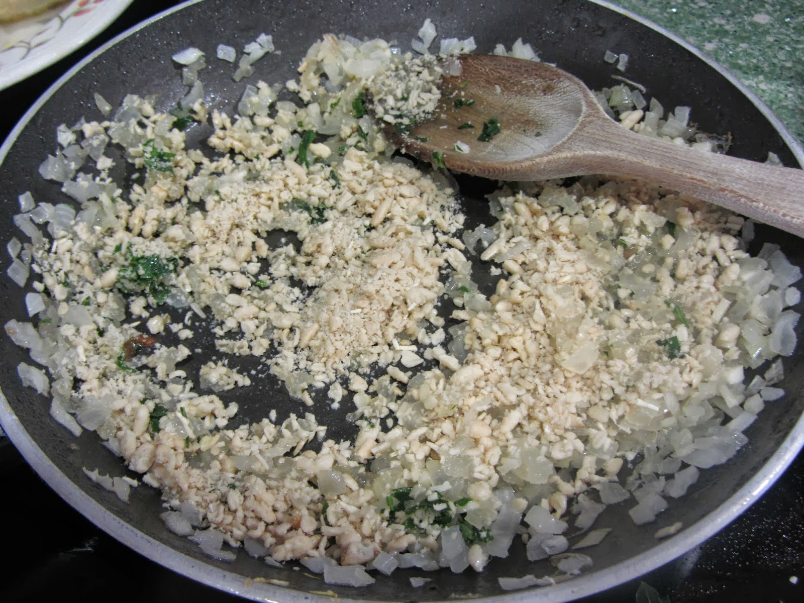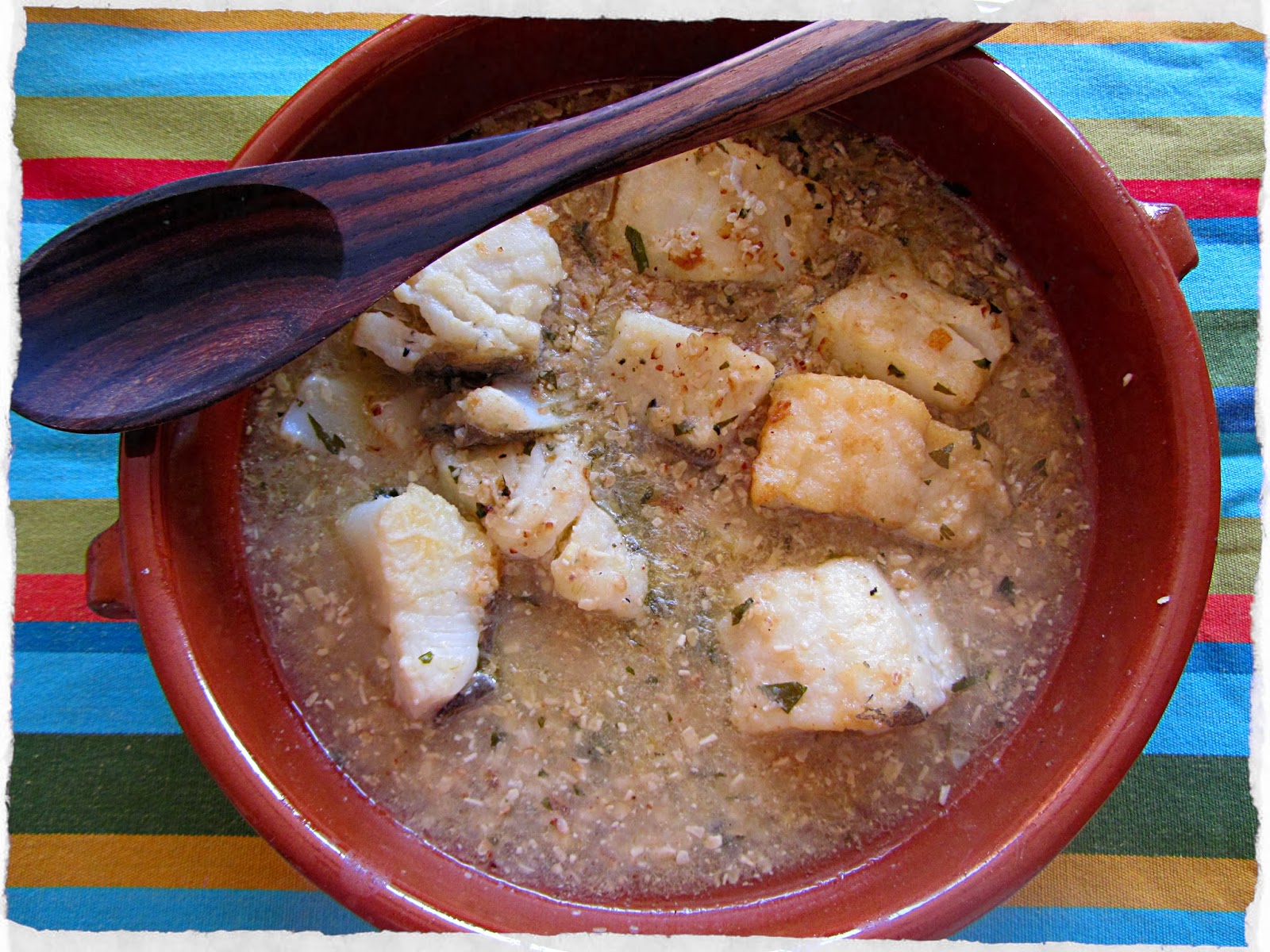 PREPARACIÓN: Desalamos el bacalao: lo ponemos en un recipiente con tapa (que no sea de aluminio, según mi madre, aunque no sé por qué), cubierto de agua, y lo tendremos desalando durante 48 horas, cambiando el agua cada 8-10 horas (y manteniendo el recipiente en la nevera). O lo compramos ya desalado. Secamos con un paño los trozos de bacalao, y los enharinamos, sacudiendo el exceso de harina. Freímos en aceite caliente hasta que estén dorados. Reservamos. Rehogamos en el mismo aceite (puede hacer falta un poco más) la cebolla picada finita, a fuego medio-suave. Cuando lleve unos 10 minutos, agregamos el ajo picadito, la pimienta,el perejil picado, y los piñones triturados (pero que se noten trocitos, no hechos harina). Cuando se empiece a dorar, añadiremos un vaso de agua y un chorrín de vinagre. Mezclamos bien, y dejamos reducir la salsa a fuego medio-suave, durante unos 15 minutos. Probamos el punto de sal, por si hubiera que añadirle un poco. Cuando se vaya ligando la salsa, se pasa a una cazuela, colocamos en ella el bacalao, y se cocina todo junto durante 15 minutos a fuego suave. NOTA: Si la salsa quedara un poco líquida para nuestro gusto, podemos agregarle una cucharadita de Maizena "Espesante instantáneo"... pero, para ver cuál es el punto exacto de la salsa, es mejor esperar al momento en que lo vayamos a consumir. Este plato está mejor si lo preparamos de un día para otro, y congela muy bien.
