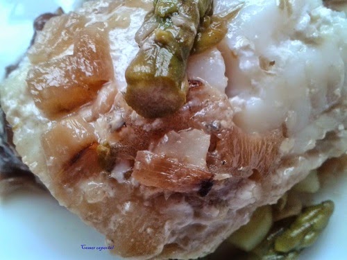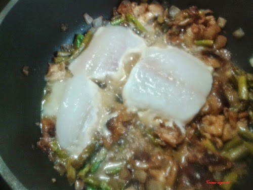 INGREDIENTES: un manojo de espárragos, unas setas o champiñones, 1 cebolla hermosa, unos dientes de ajo, un buen vaso de vino blanco, tomillo, aceite, un poco de agua por si hiciera falta, 2 lomos de bacalao y un poco de sal.