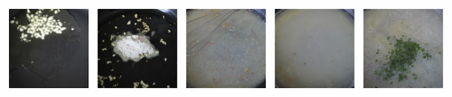 Cuando los ajos comience a dorarse, añadimos la cucharada de harina y, removemos, con ayuda de un batidor, sin parar para que no se nos queme la harina.