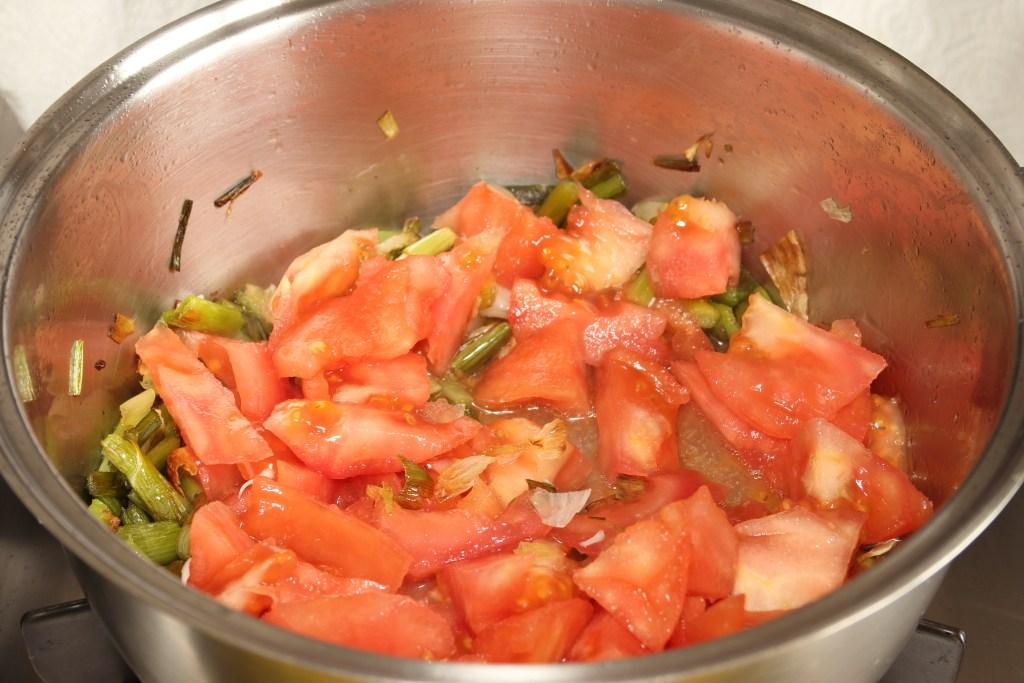 En una sartén o cazuela amplia, rehogamos los ajetes con un chorro de aceite. Cuando estén blandos añadimos el tomate, rehogamos bien hasta que se ablande.