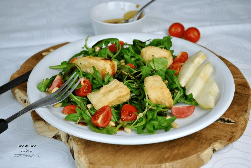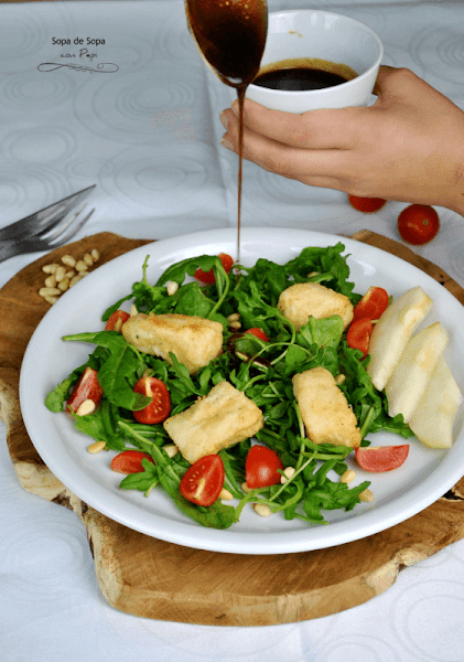 Aquí puedes jugar con los ingredientes que más te guste. Puedes cambiar la rúcula por otro tipo de lechuga e incluso el bacalao por otro tipo de pescado.