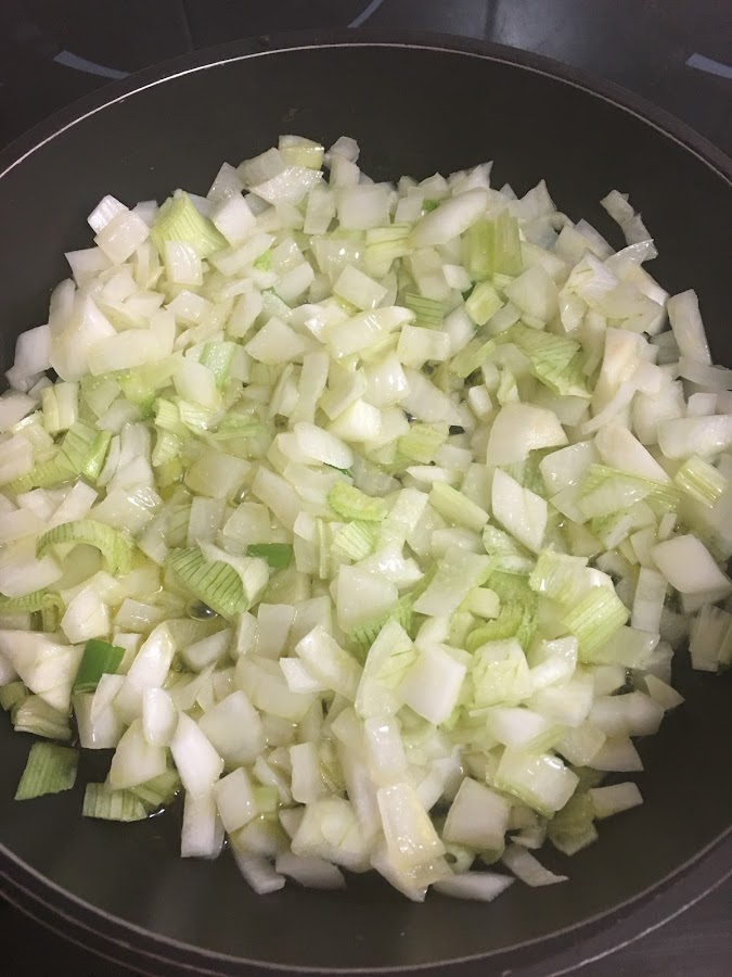 En una sartén se pone un poco de aceite de oliva y se calienta fuego medio. Se añade el otro diente de ajo picado y se cocina unos instantes. Se añaden las cebollas peladas y picadas y se dejan pochar unos minutos hasta que se vuelvan transparentes.