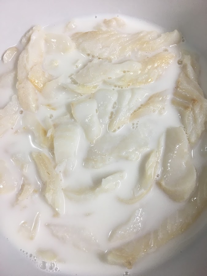 Una de las peculiaridades de esta receta es que el bacalao se remoja en leche y eso le da un plus de jugosidad.
