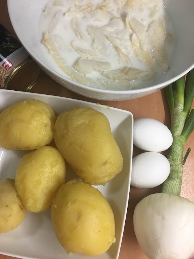 Realmente el plato solo precisa de la espera del remojado (si el bacalao es salado) y de un tiempo de empapado en leche. Luego se cuecen las patatas y se mezclan con las cebollas pochadas.