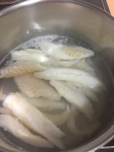 Cuando se empiece a preparar la receta, se escurre el bacalao del agua de remojo. Se pone agua en un cazo y se lleva a ebullición. Se introducen las migas de bacalao. Se deja que llegue de nuevo a ebullición y, en cuanto hierva se deja cocer 2 minutos. NO se tira el agua de cocción.