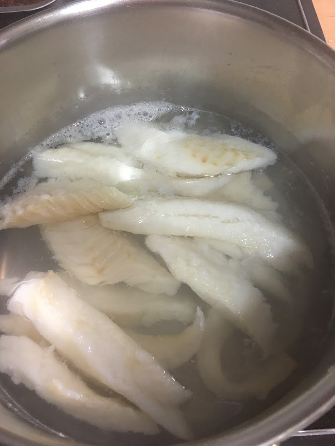 sal y pimienta recién molidaEl previo 36 horas antes es el remojo del bacalao en agua fría, con la piel hacia arriba (si hemos comparado lomos, aunque para este plato se preferible usar bacalao desmigado). Cambiamos el agua cada 8 horas y mantenemos el bacalao en una bol en la nevera tapado con papel film.