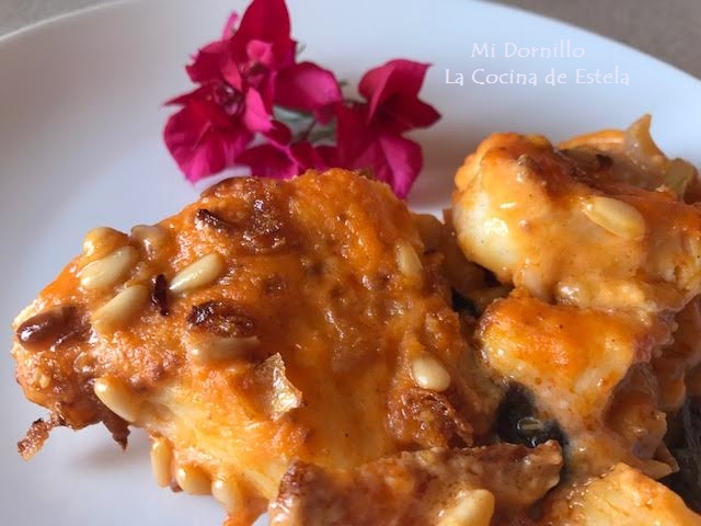 Ponemos nuestra bechamel por encima del bacalao cubriéndolo bien y encima los piñones. Y un puñado de cebolla frita.
