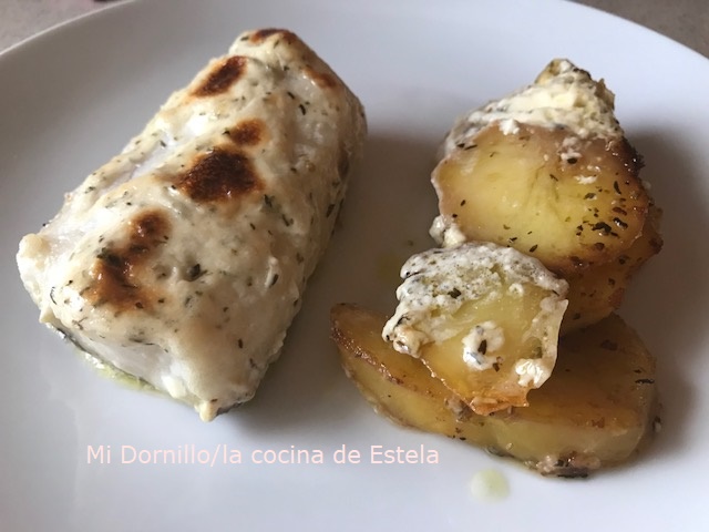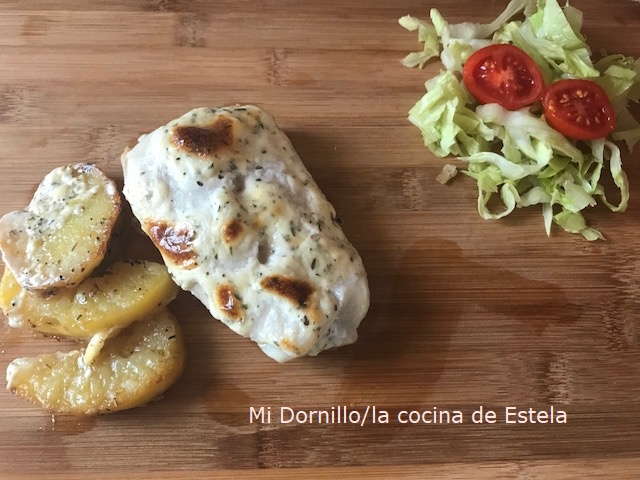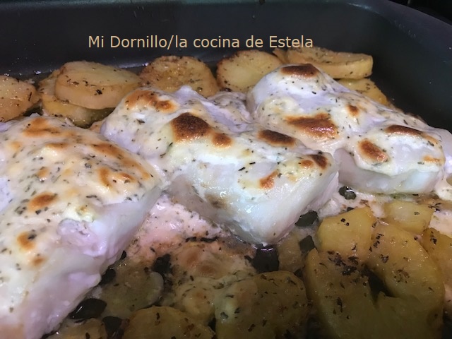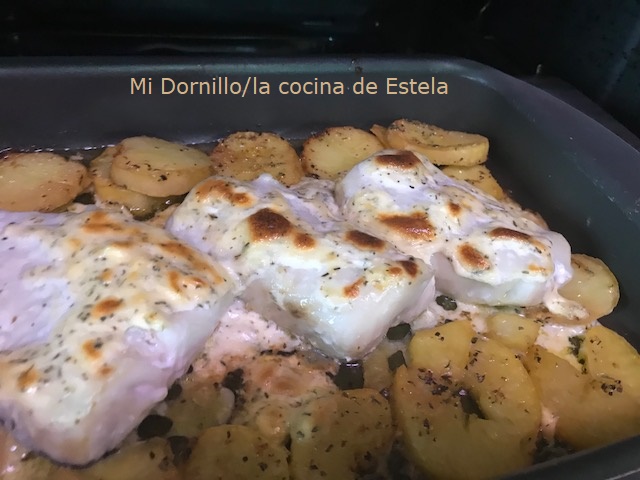Poner los lomos encima de las patatas y bañarlos con la mayonesa de ajo. Meter de nuevo en el horno unos 10, 15 min. según horno hasta que doren y que no se seque mucho el Bacalo, a mi me quedo jugoso en 10 min. ¡¡Riquisimo!!