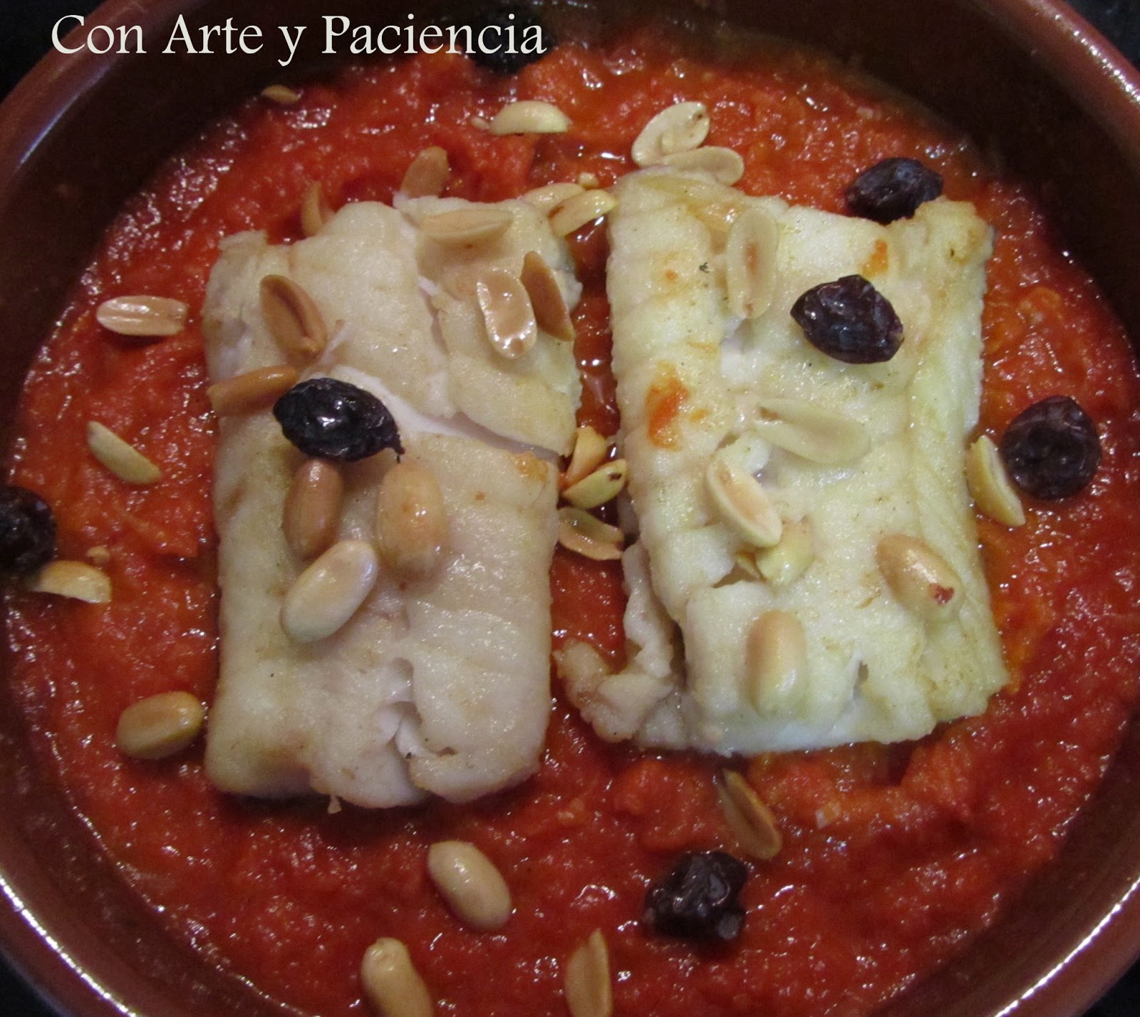 Esta receta es propia del sur de España y aunque se come en cualquier época del año se hace más por Semana Santa. Su combinación de pescado con dulce y salado es toda una tentación para nuestro paladar. Si no tenéis bacalao podéis sustituirlo por otro como rape. Igualmente podéis añadir los frutos que más os gusten.