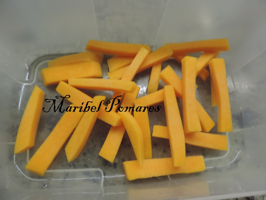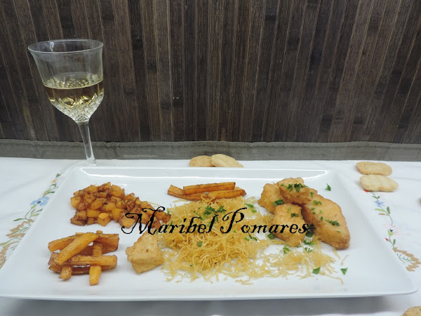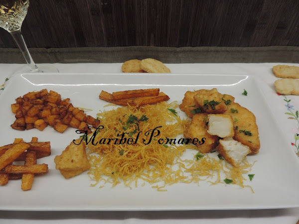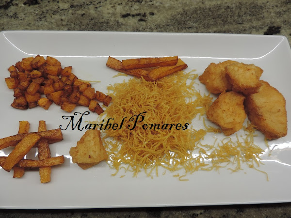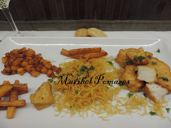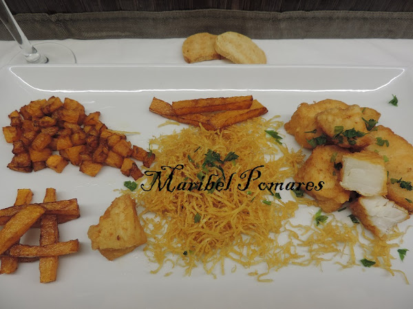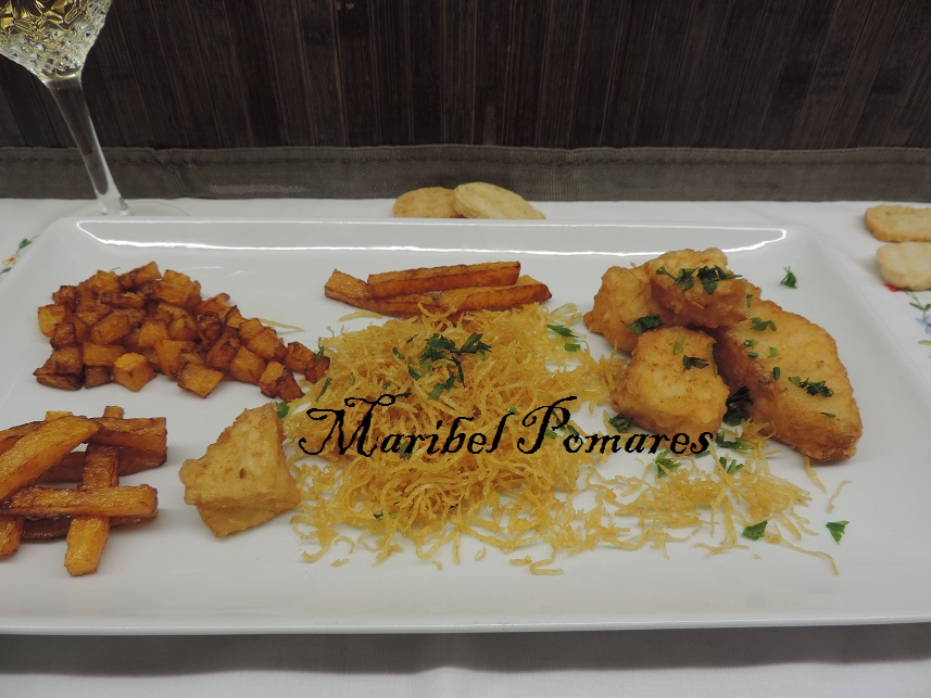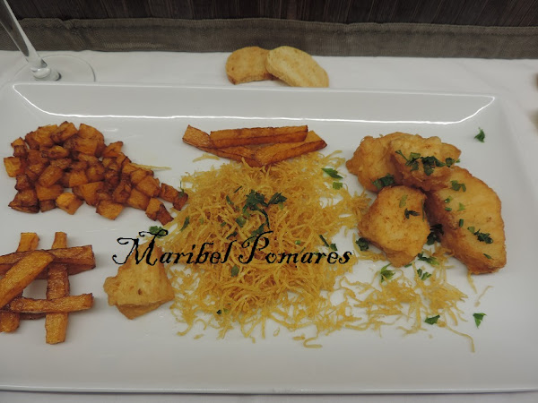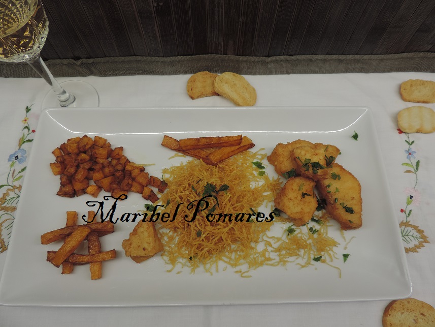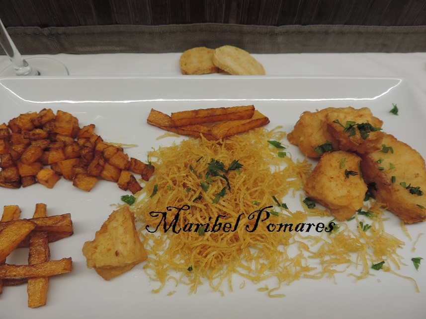En el centro las patatas paja, en un lado el bacalao y en el otro la calabaza.