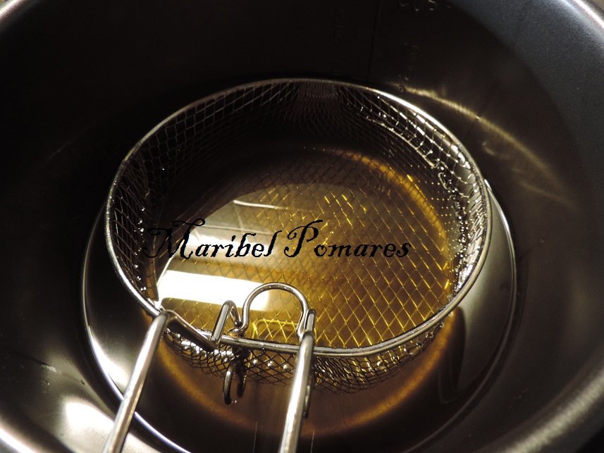 Ponemos el aceite en la cubeta de la olla, metemos el cestillo.