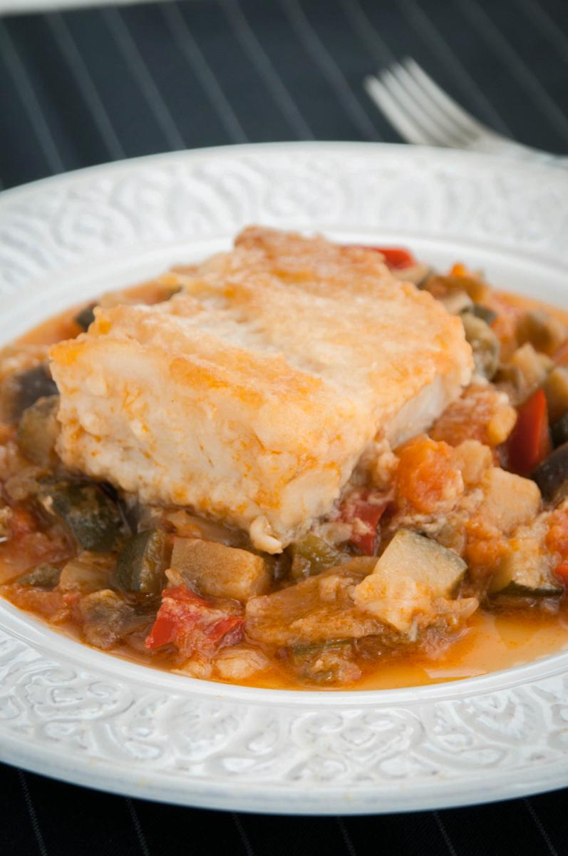 7.- Añadimos los lomos de bacalao ya dorados a la cazuela una vez que tengamos el pisto listo, con las verduras totalmente pochadas y estofadas en su propio jugo. Cocinamos el pescado en el estofado de verduras durante 6 o 7 minutos. En este punto es cuando debemos comprobar la sal. El bacalao habrá aportado parte de la suya a las verduras, por eso debemos de tenerlo en cuenta a la hora de salar el plato.