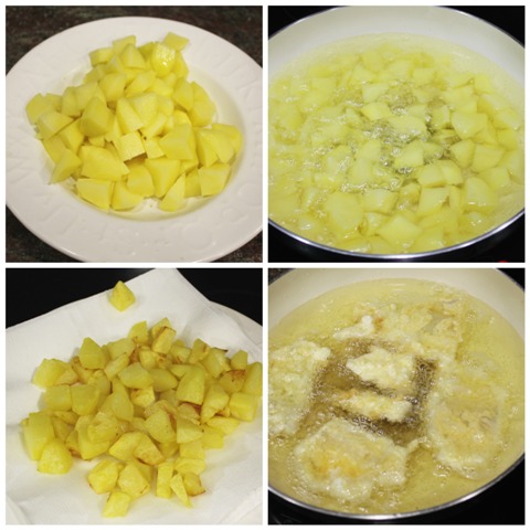 Ponemos abundante aceite en una sartén (yo para freír utilizo aceite de girasol pues deja menos sabor, pero no lo reutilizo). El aceite estará muy caliente a una temperatura media-alta y las tendremos hasta que estén un poquito doradas y bien hechas por dentro. Las dejamos en un plato en el que previamente habremos puesto papel de cocina para que absorba el exceso de aceite.