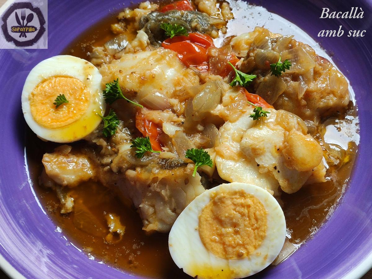 Bacallà amb suc, o bacalao con caldo, a esta receta no le puede faltar pan para rebañar bien el plato. Está tan rica y es tan sana, que con una ensalada ligerita, ya no le hace falta nada más, está de rechupete! Se le suelen añadir alcachofas, pero me ha sido del todo imposible encontrarlas…así que aquí lo tienes!