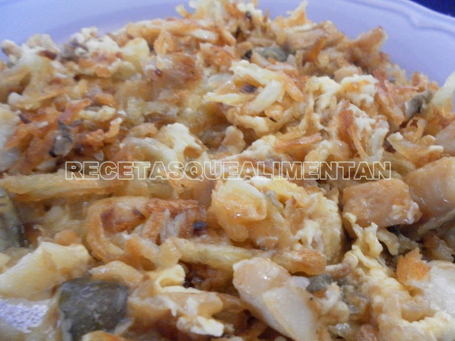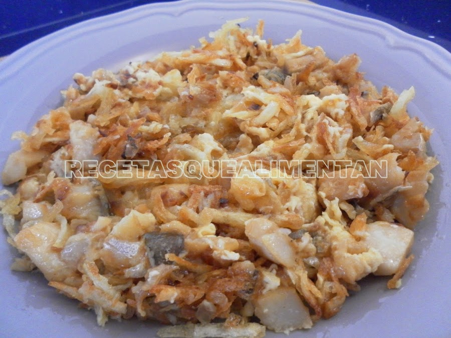 500 gr bacalao, 500 gr patatas, una cebolla, 3 huevos, aceite de oliva, pimienta negra molida, sal.