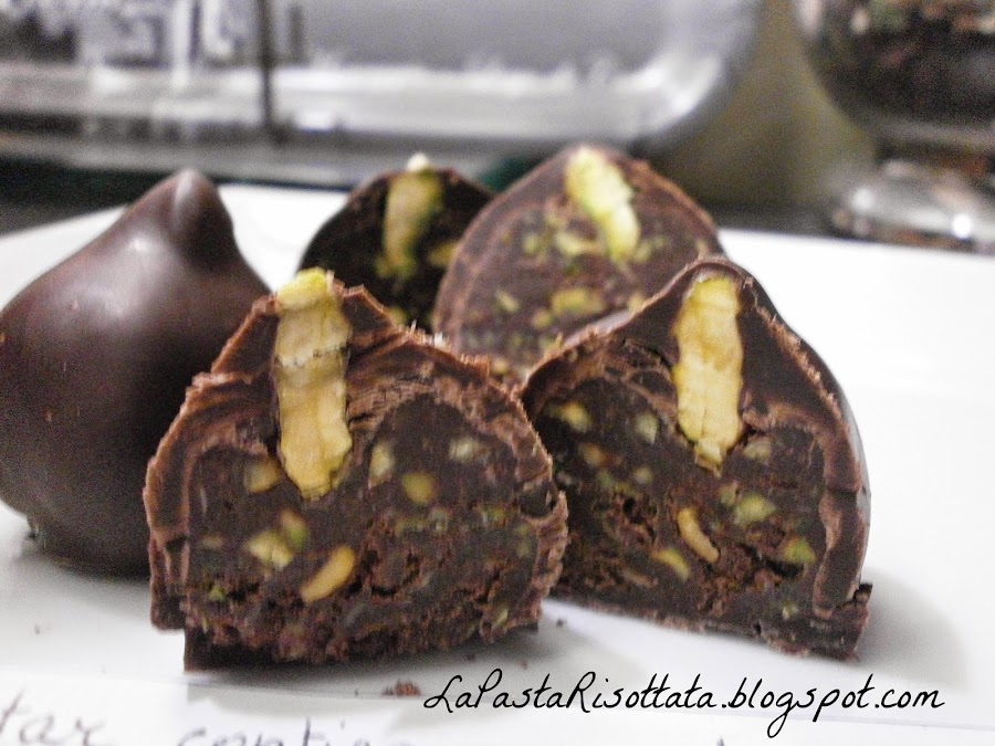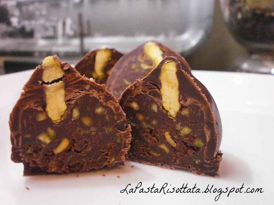 Pasar uno o dos minutos en la nevera y luego, rodando entre las manos, darle una forma esférica. Volver a ponerlos en la hoja e insertar un pistacho en la parte superior de pistacho presionando ligeramente para fijarlo.