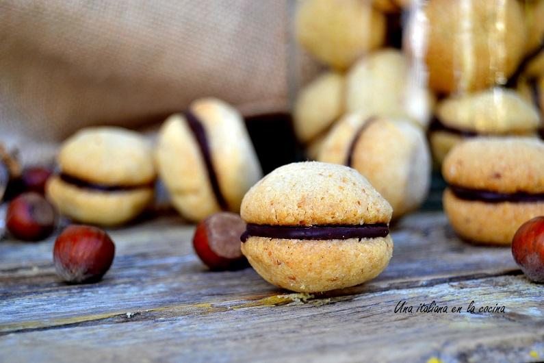 Besos de dama, mejor dicho baci di dama, son unas galletas tradicionales italianas típicas de la región Piemonte. ¿Los has probado nunca? Te aseguro que son una autentica delicia. La combinación de chocolate y avellanas los hace irresistibles y quedan muy crujientes. Tendrás que ponerte un limite cuando empieces a comerlos. Tradicionalmente los besos de dama se hacen con avellanas (las de Piemonte son muy famosas) pero es muy común encontrarlos hechos de almendras (mucho más baratas que las avellanas). El nombre de estas galletas es curioso, se llaman así porque parecen los labios de una mujer que está dando un beso (habría que ver que se tomó el que le puso el nombre, yo no consigo verle el parecido. ¿Y tu?).Esta receta italiana es bastante sencilla pero si muy entretenida, ya lo verás durante su elaboración. Los baci di dama originales se comen de un bocado, son muy pequeños y las bolitas de masa deberían pesar unos 3 máximo 4 g (los míos se comen con 2 o 3 bocados). En mi situación actual tengo poco tiempo y aún menos paciencia que me sobre así que he hecho galletas más grande de 7 g. Es muy importante pesar la masa de cada galleta. Con cantidades tan pequeñas un gramo más o menos marca la diferencia a la hora de hornear y luego hacer las parejas. Si quieres hacerlos del tamaño tradicional, es decir de 3 g, te aconsejo hacer la mitad de la cantidad de la masa para que no te tires una hora o más haciendo bolitas.