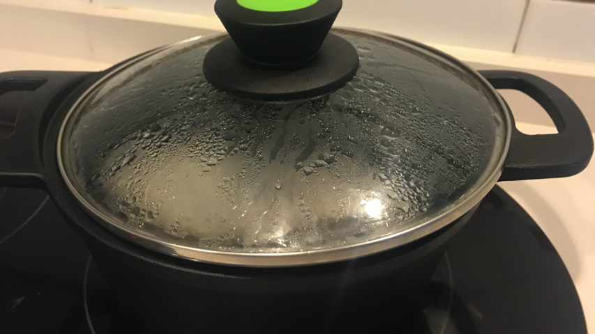 Pasada la hora introduce la patata pelada y enjuagada -entera, sin cortar-. Baja el fuego y deja cocer durante unos 30 minutos (o los suficientes para que la patata esté tierna al pincharla con un cuchillo).