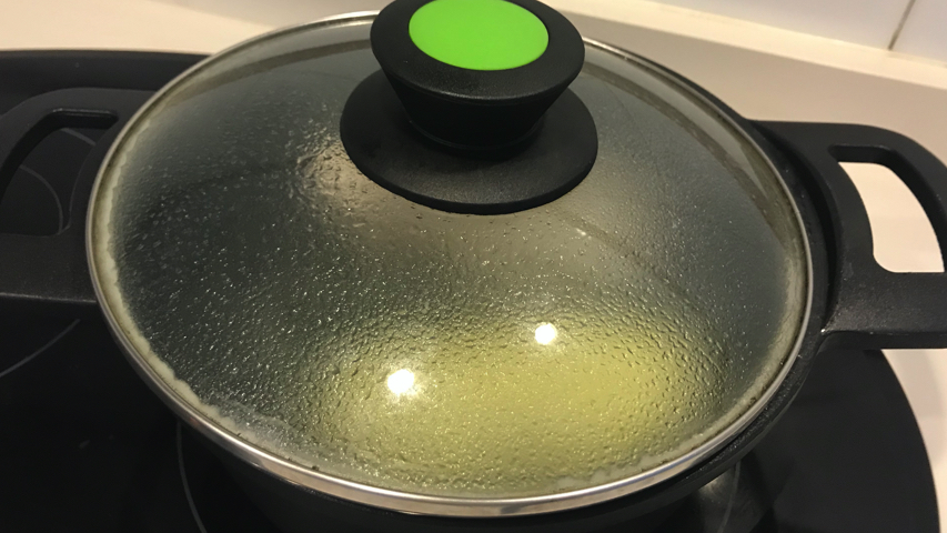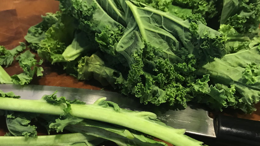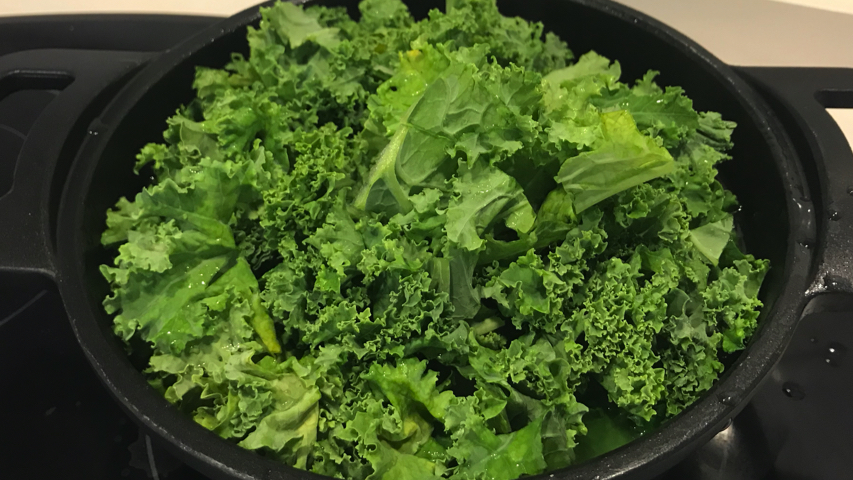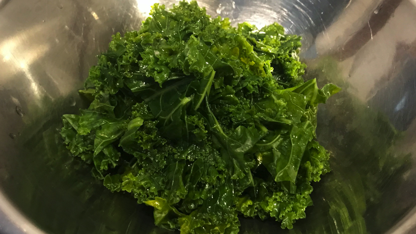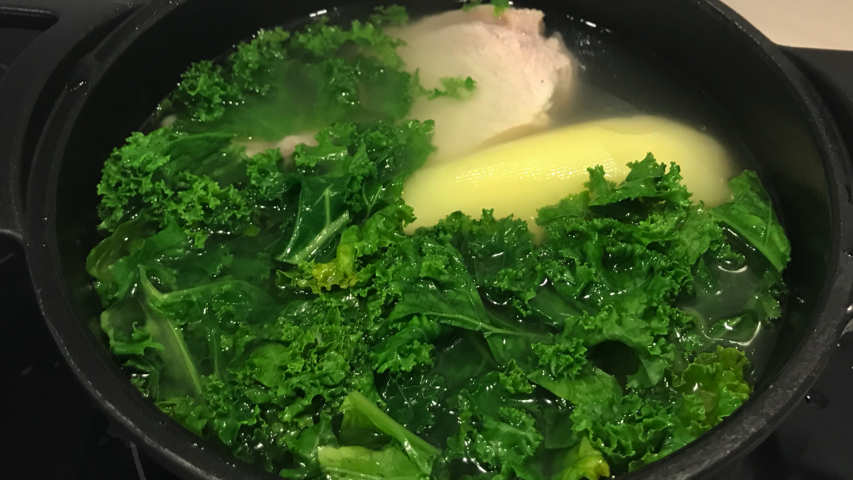 Retira el tronco al kale y corta las hojas en trozos. Enjuágala bajo el grifo en un colador. Introdúcela en la olla durante la últimos 15 minutos de cocción.