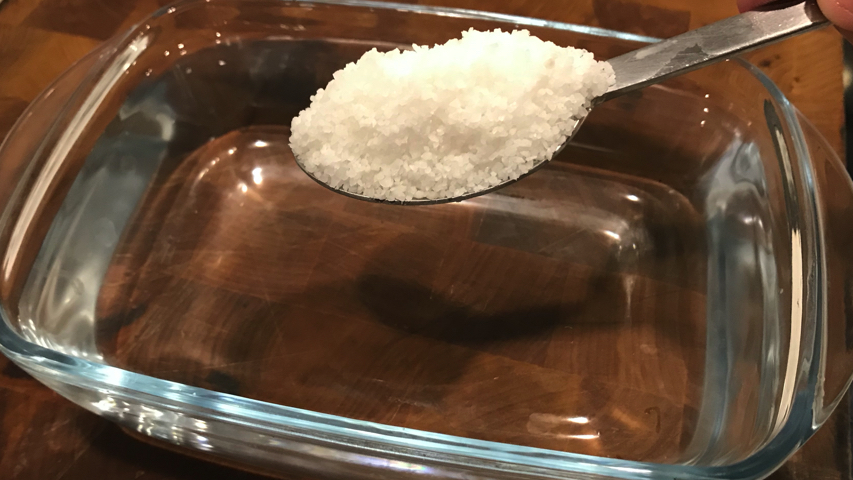 Prepara una salmuera. Cada litro de agua con 2 cucharadas soperas colmadas de sal. Mueve para que se disuelva la sal.