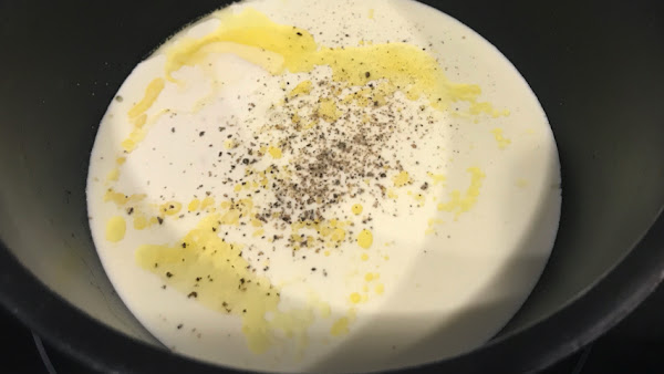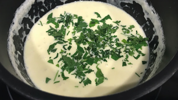 Prepara la salsa de perejil: en un cazo a fuego medio pon una pizca de mantequilla, añade la nata (crema de leche) -crema de leche- y deja que reduzca hasta que espese un poco. Añade perejil fresco picado, pimienta y sal al gusto.