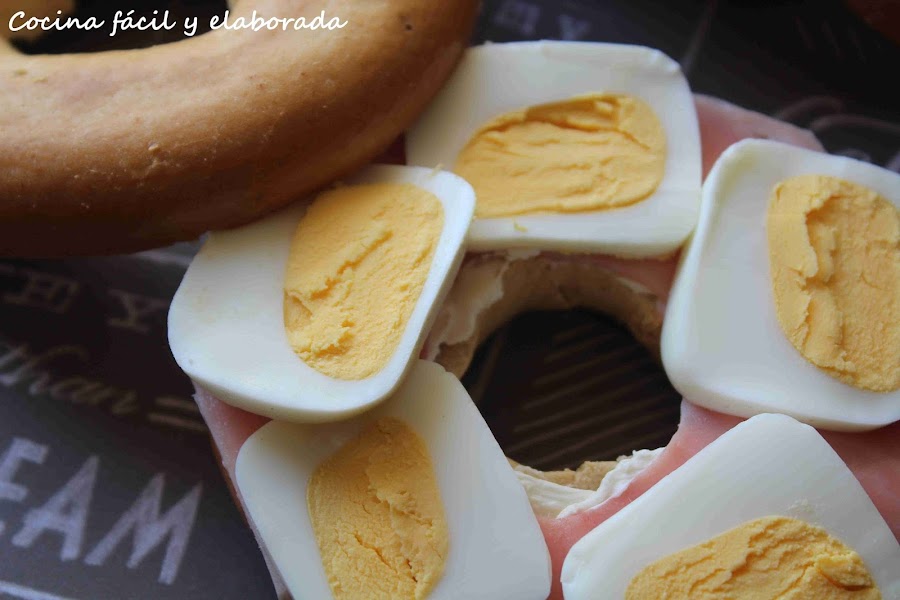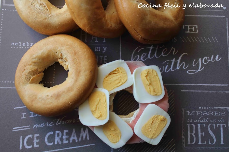 En mi viaje a New York hace un año, me aficioné a desayunar un bagel por las mañanas, allí causa furor este pan que se hace con pan de trigo, que tiene como los donut un agujero en el centro y que se hace con la mas tradicional de pan pero que se cocina en agua antes de hornearlo y eso le da una textura crujiente por fuera y por dentro una masa densa y os aseguro que una vez que lo probéis vais a repetir muchas veces más, palabra de cocinillas, jeje.