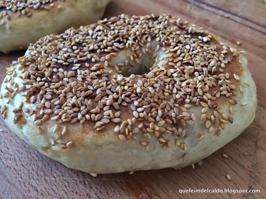 Calentamos alrededor de 2 l. de agua y le incorporamos una cucharada sopera de azúcar, cuando rompe a hervir el agua bajamos la potencia a mitad, introducimos los bagels en el agua y dejamos cocineros durante 6 minutos dandole la vuelta a mitad de cocción.