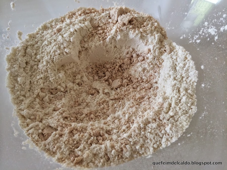 Empezamos por los bagels, mezclamos todos los ingredientes secos, hacemos un volcán en medio.