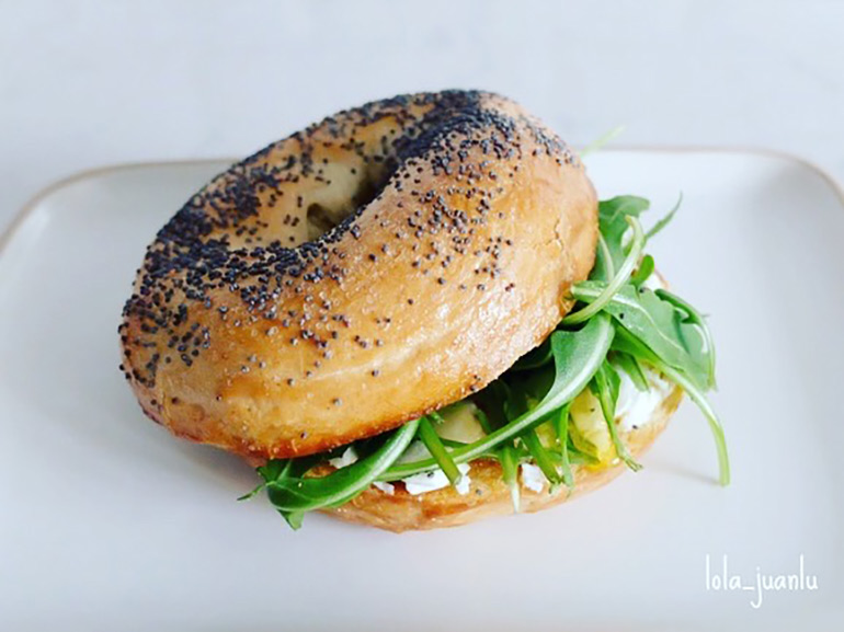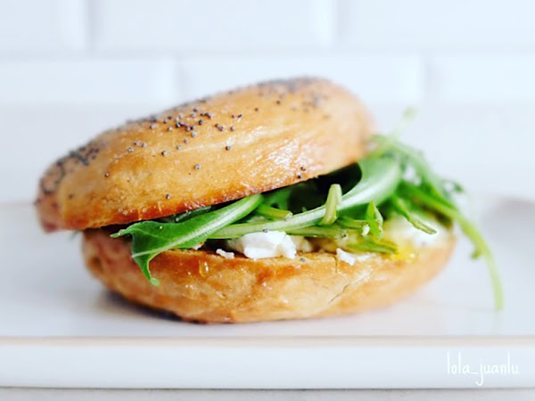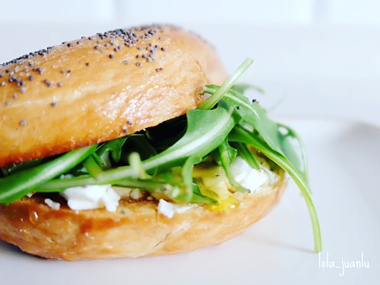 Con cada bocado al bagel descubriremos las diferentes texturas, sabores y aromas de este sencillo plato. El tierno crujir del panecillo tostado, el grano de la semilla de amapola, la cremosidad y acidez del queso de cabra, la dulzura de la miel y el crujiente, fresco y un poco picante de la rúcula. ¿Se puede pedir más?