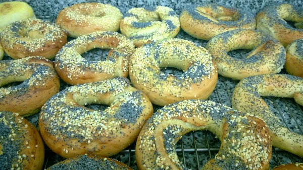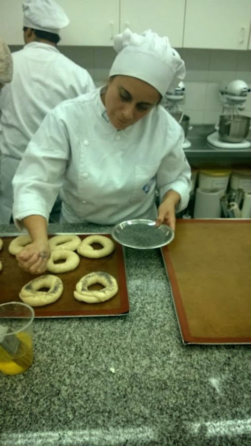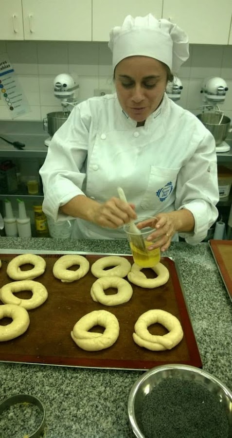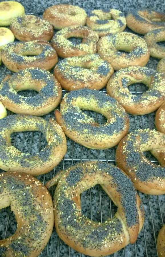 Colocar en el bol de maquina todos los ingredientes menos la sal, amasar durante 7 minutos aproximadamente, luego agregar la sal y continuar el amasado durante dos minutos más. Dejar descansar durante 5 minutos, estirar y dividir en pastones y ovillar formando cilindros de 2 centímetros de diámetro (tipo baguette). Dejar descansar 5 minutos, luego fraccionar la masa en piezas entre 15 a 22 cm dependiendo del tamaño deseado. Unir las puntas y apretar bien. Dejar lavar a ¾ de fermentado. Pochar durante 2 minutos en el líquido, pintar con claras y decorar con semillas. Terminar la cocción al horno a 200 °C hasta dorar.