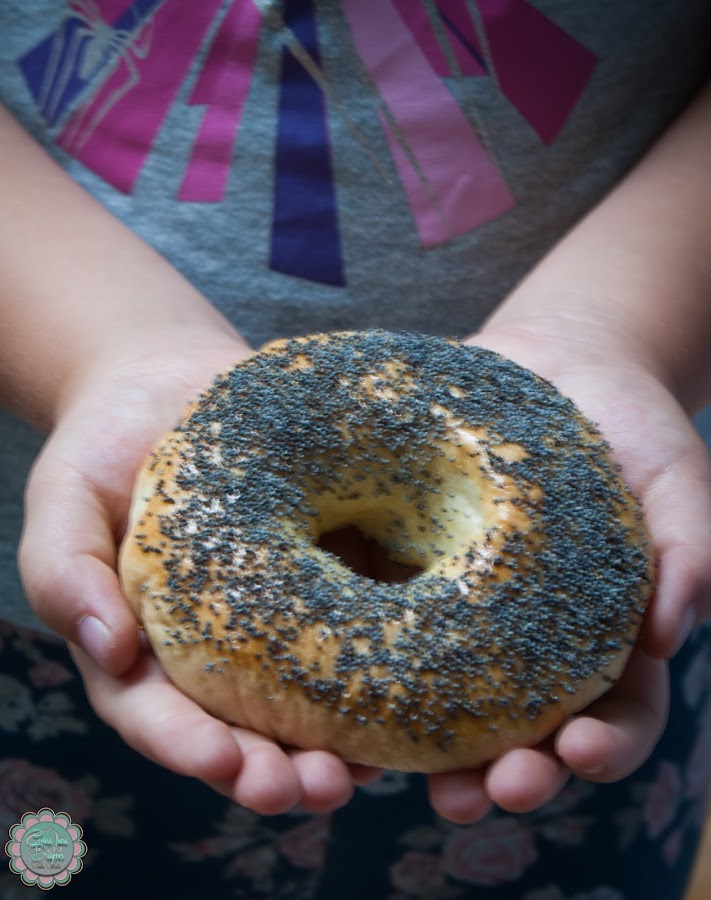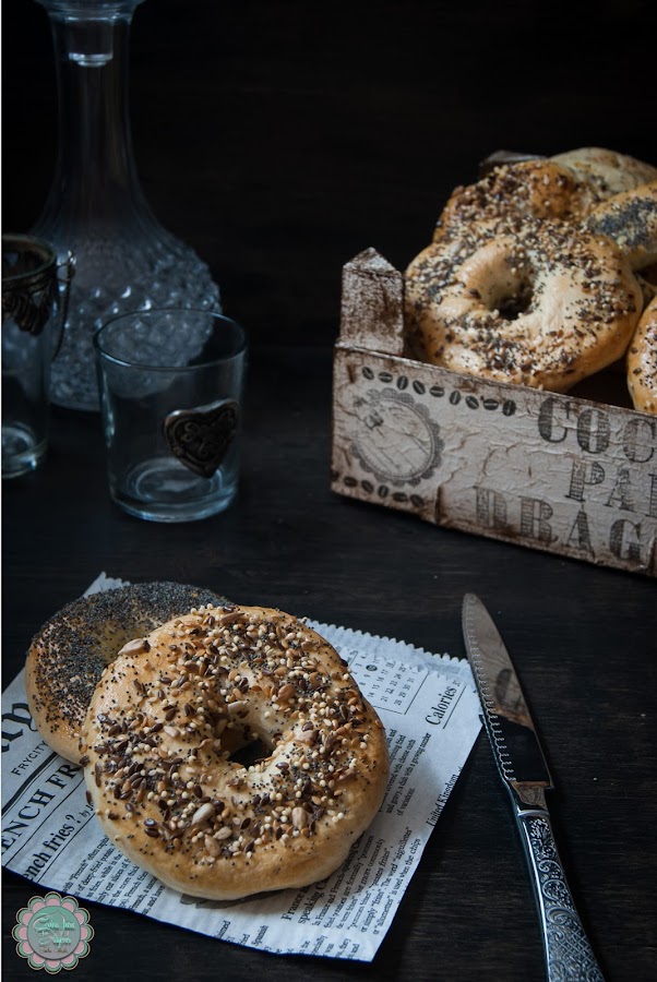 8) Pincelamos con huevo batido y ponemos las semillas por encima. Horneamos hasta que estén dorados.Si preferís, podéis poner sal gruesa por encima, chips de chocolate o lo que os apetezca. Los bagels están espectaculares el mismo día que los hemos hecho. Al día siguiente, como todos los panes de fermentación rápida, pierden bastante, aunque tostados están buenísimos igual.