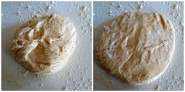 Volcamos la masa en la superficie de trabajo levemente enharinada y la desgasificamos con suavidad.