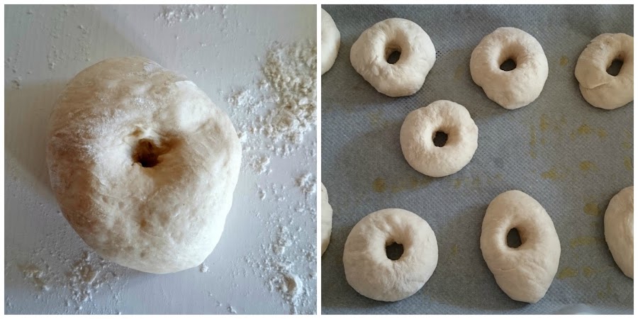 Presionamos con el pulgar en el centro de la bola y hacemos un agujero. Ensanchamos este agujero lo que podamos teniendo cuidado de no desgarrar la masa. Cubrimos una bandeja con papel de horno y lo untamos con aceite. Colocamos los bagels sobre ella. Los dejamos reposar 10 minutos tapados con un paño de algodón.