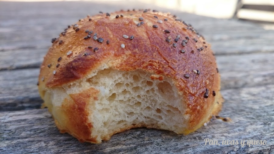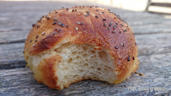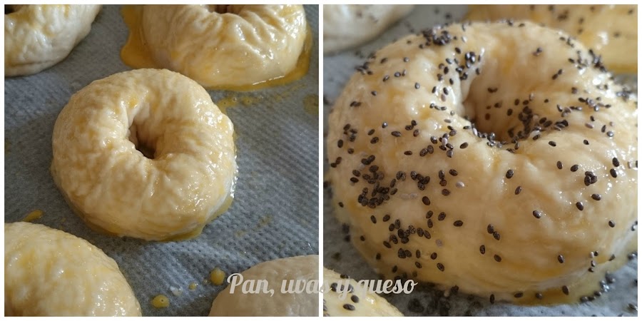 En un cazo calentamos agua hasta que hierva. Cogemos los bagels uno a uno y los pasamos por agua hirviendo durante unos segundos. Los devolvemos a la bandeja del horno. Cogemos la yema de huevo que habíamos reservado, la batimos y pintamos con ella los bagels. Por encima espolvoreamos las semillas, en mi caso de chía.