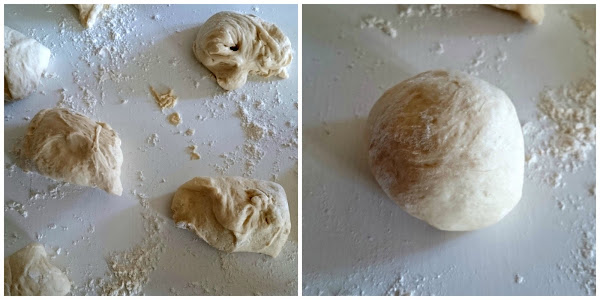 Cortamos la masa en porciones de 80 gramos y las dejamos reposar tapadas con un paño de algodón 10 minutos. Cogemos cada porción y hacemos una bola con ella. Si la masa se pega a las manos podemos untárnoslas con aceite.
