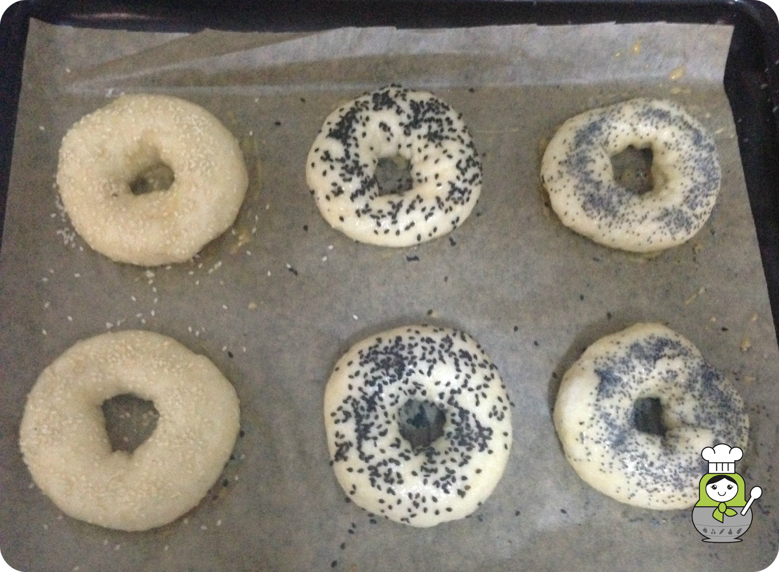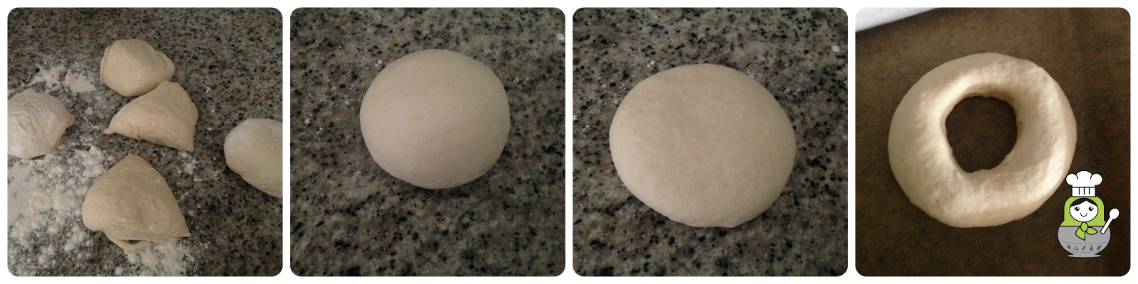 Cuando la masa esté lista, la volcamos en la superficie enharinada y formamos bolas, tantas como bagels deseemos hacer (a nosotras nos salen unos 800 gramos de masa y entonces hemos hecho 10 bolas de 80 gramos aproximadamente). Le damos forma a cada bola, la aplastamos con la palma de la mano y luego introducimos el dedo en el centro y vamos girando hasta que se forme un anillo. Una vez formado cada bagel lo colocamos en la bandeja del horno forrada con papel sulfurado y cubrimos bien con un paño de algodón para evitar que se forme una película en la masa. Dejamos levedar nuevamente durante media hora.