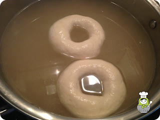 Ahora calentamos el horno a 220ºC y mientras tanto ponemos en una olla grande agua junto con el azúcar moreno, la sal y la maicena. Cuando hierva el agua, cocemos los bagels por tandas. Primero los cocemos durante 1 minuto por un lado, luego le damos la vuelta y los cocemos otro medio minuto por el otro. Retiramos los bagels de la olla con una espumadera y dejamos escurrir sobre un paño para eliminar le exceso de humedad. Así hasta cocer todos los bagels.