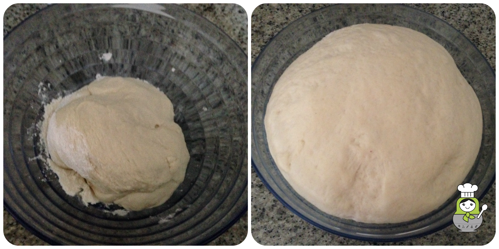 Diluimos la levadura en el agua tibia y colocamos junto con todos los ingredientes en un bol. Amasamos durante unos 10 minutos si es con un robot o 15 minutos si lo hacemos a mano. Formamos una bola y la dejamos reposar durante 2 horas (o hasta que doble su volumen) en un bol enharinado y tapado con paño de algodón dentro del microondas o en un lugar sin corrientes.