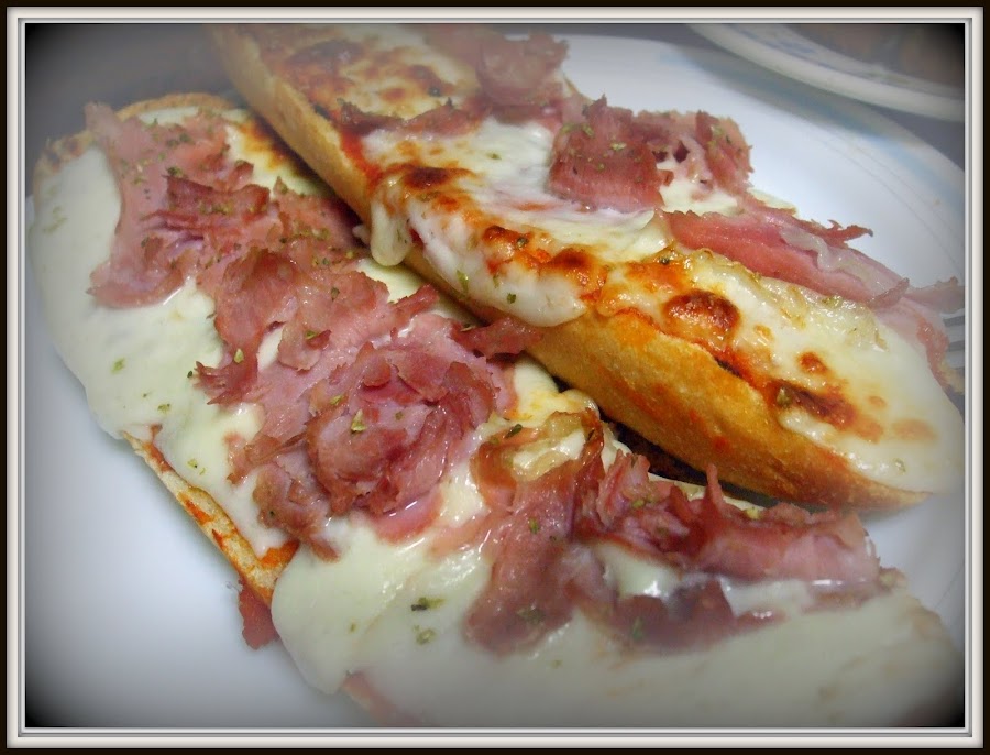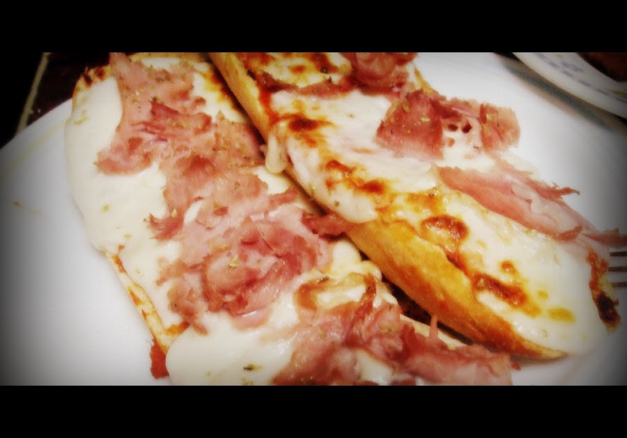 INGREDIENTES: UNA BAGUETE (ECHA) CONGELADA CORTADA A MEDIO TOMATE CASERO CON CEBOLLA QUESO EN LONCHAS CALIDAD JAMON YORK OREGANO PARTIR EL PAN Y UNTAR LAS DOS MITADES CON EL TOMATE CASERO ECHAR OREGANO ENCIMA PONER EL QUESO PONER EL JAMON YORK Y PONER MAS OREGANO ENCIMA GRATINAR EN EL HORNO UNOS 5 A 10 MNTS